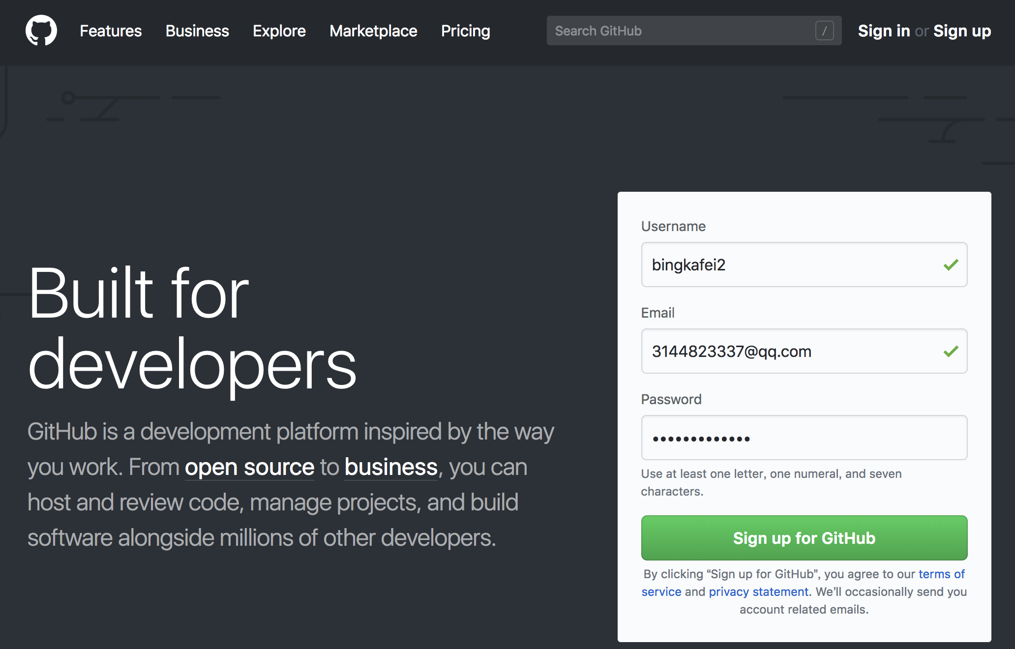 1.First, you need to open the websethttp://github.com/, sign up for a Github account,click the "sign up" button. Follow the prompts step by step registration, you need to fill in some information.