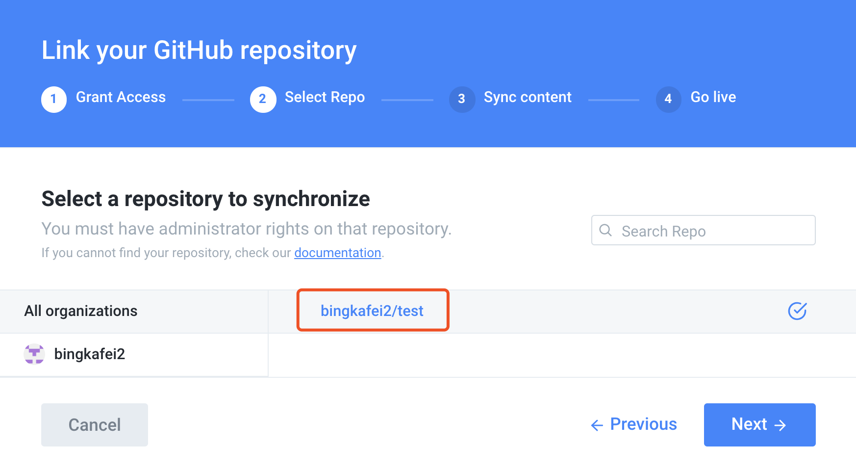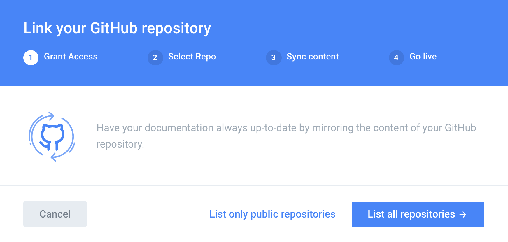 Gitbook will automatically search your nearest Github and find the warehouse inside. We choose "List all repositories"