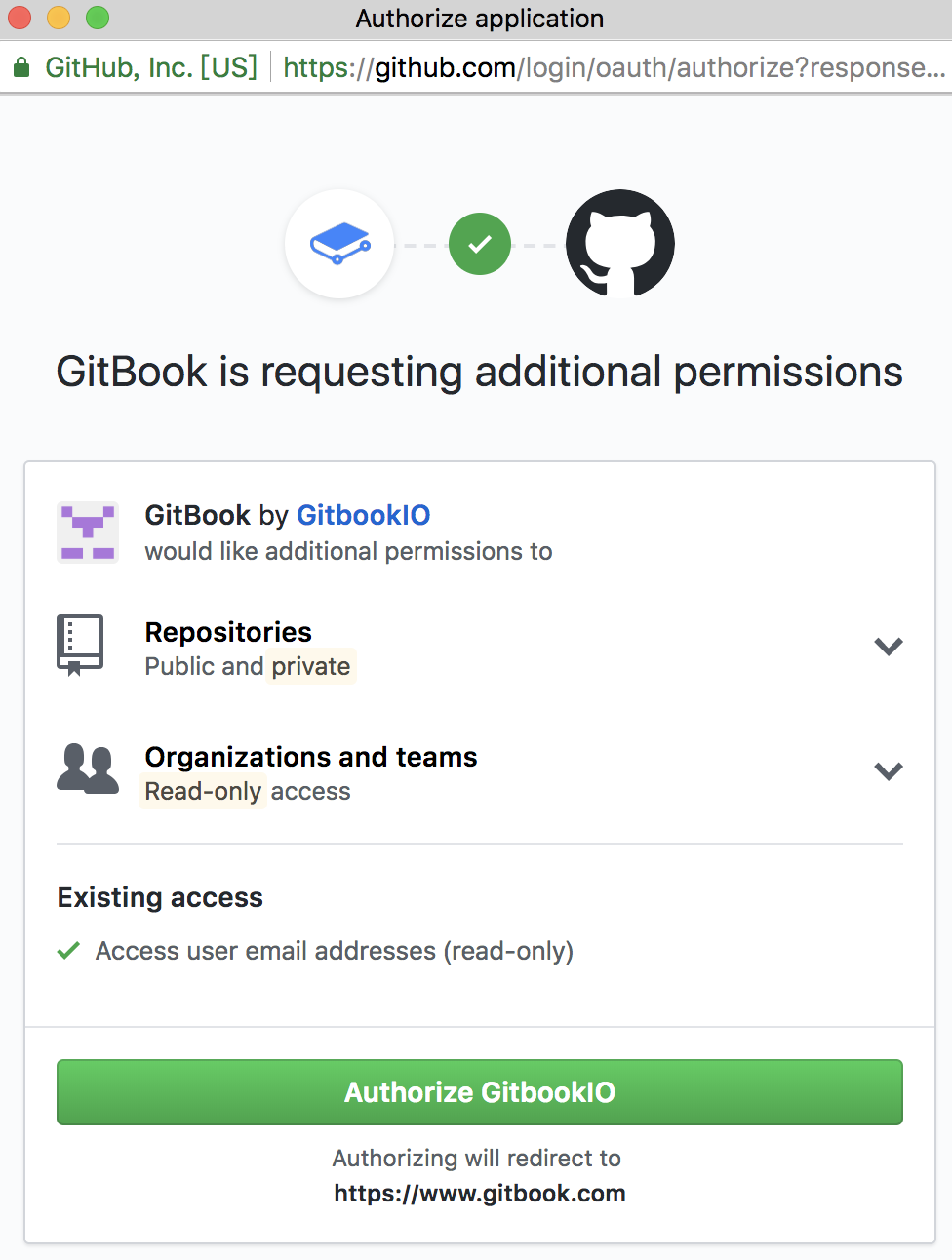 At this point, Gitbook will issue an association request to Github. We just click on the authorization button "Autorize GitbookIO".