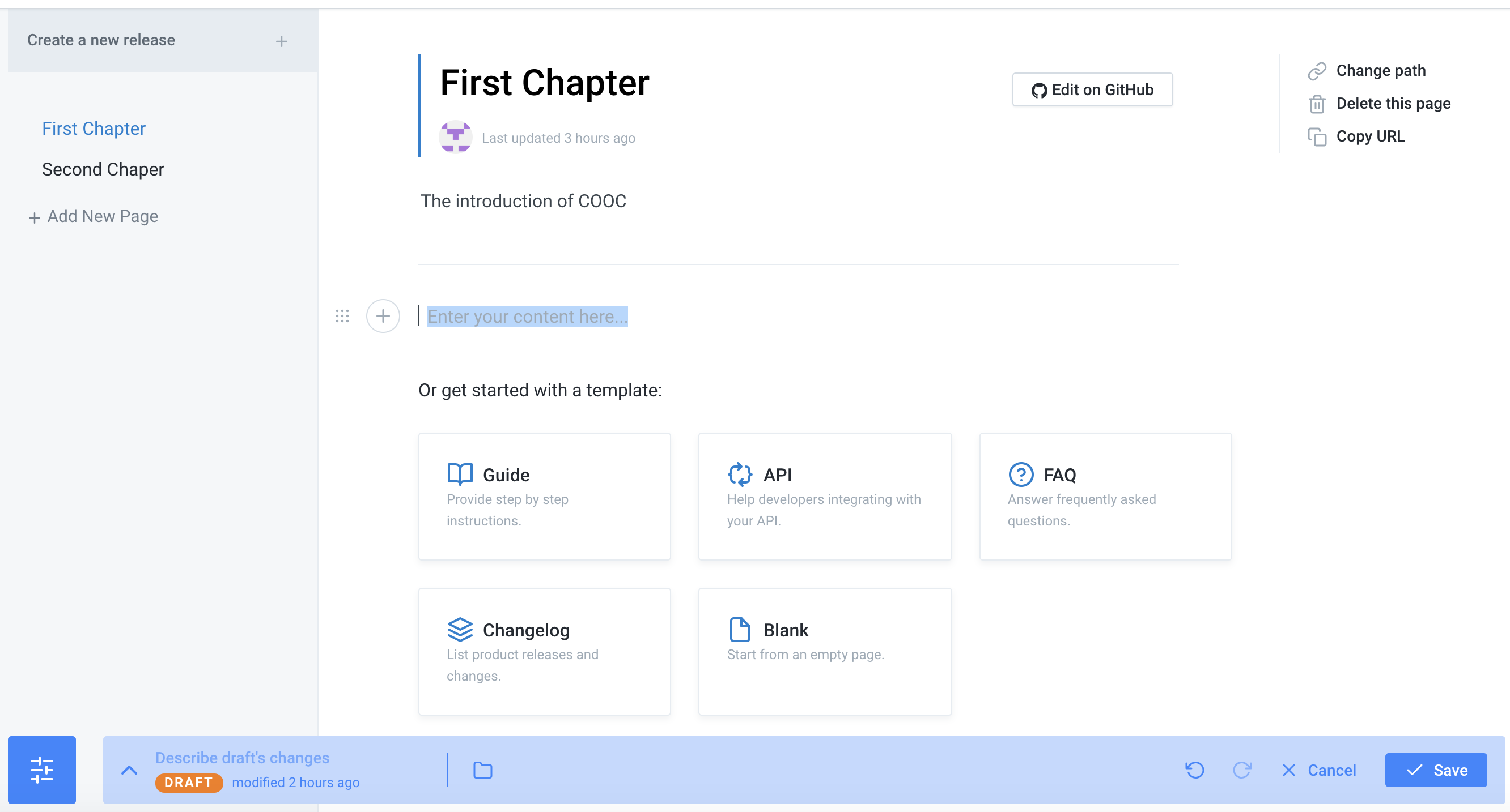 6.After entering the book, the edit interface is as follows. We click the setting button on the lower left corner to associate with GitHub.