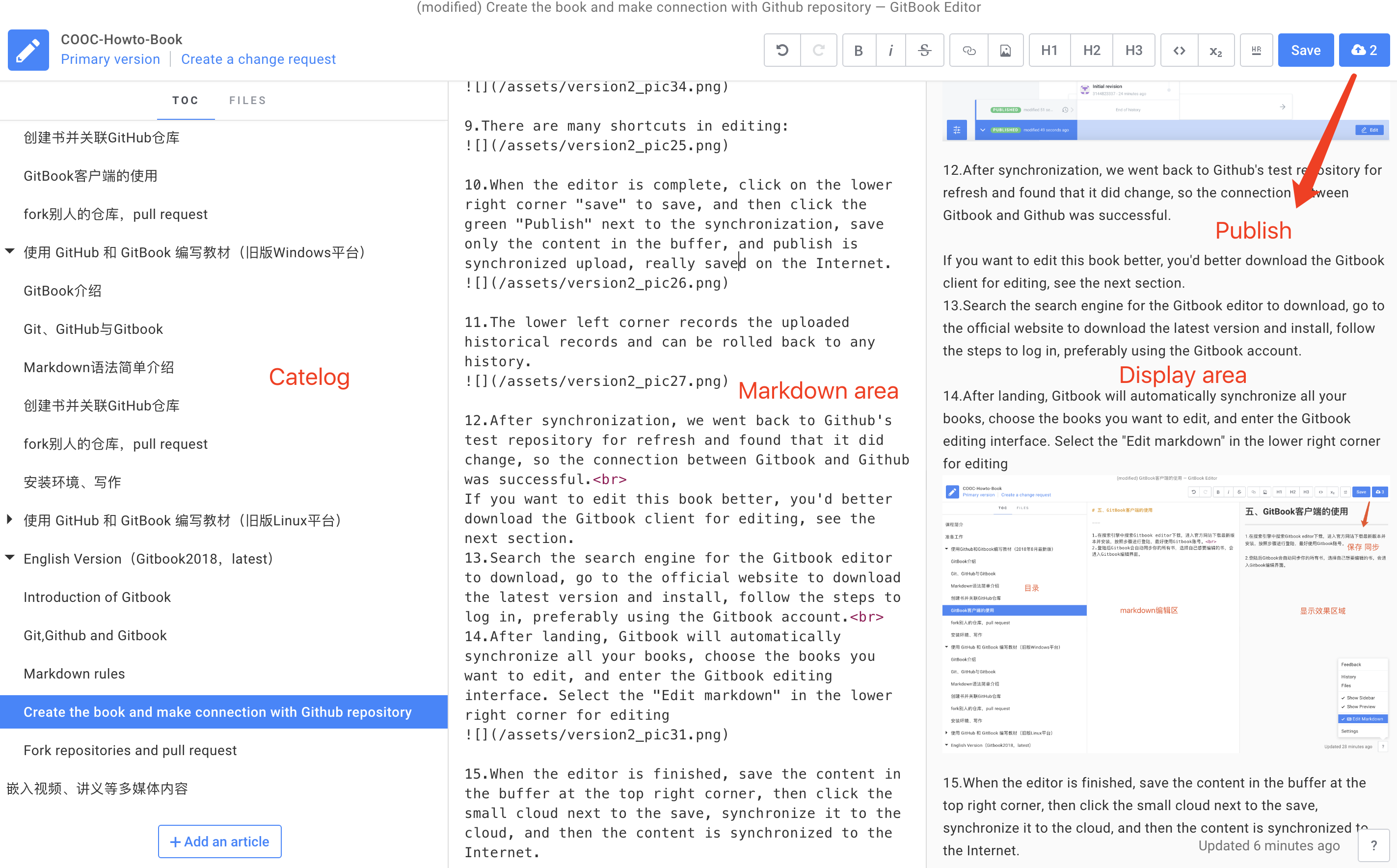 14.After landing, Gitbook will automatically synchronize all your books, choose the books you want to edit, and enter the Gitbook editing interface. Select the "Edit markdown" in the lower right corner for editing