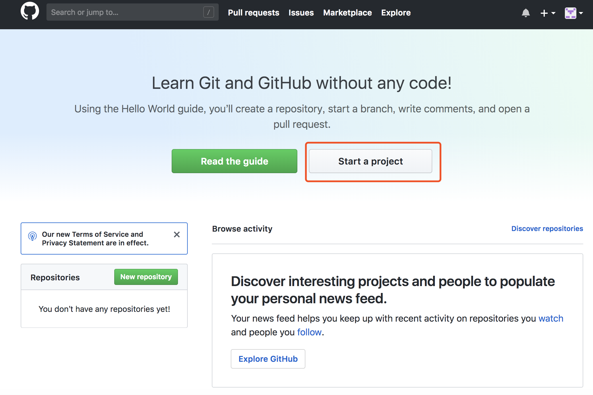 2.After registering GitHub, login the mailbox to verify, enter Github, create a project, click "start a project".