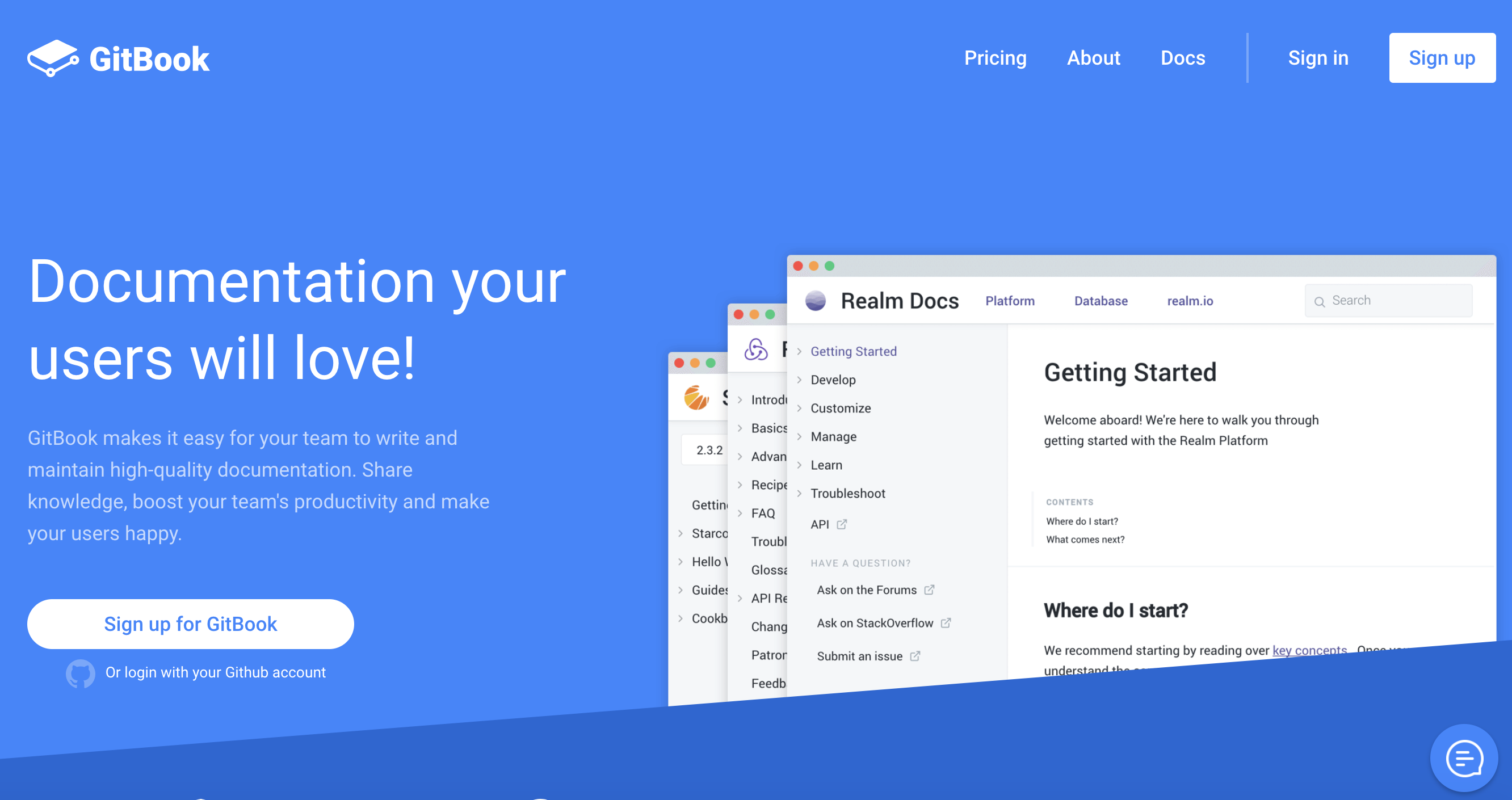 3.Take into the websitehttp://gitbook.com, as shown in the following figure, click on the top right corner for registration. It is strongly suggested that a GitBook account must be registered separately, otherwise it will be very troublesome when using the GitBook client in the back.